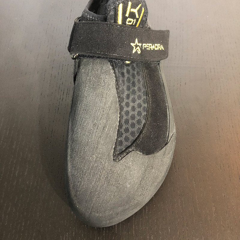 K-01は、ホールドに点で乗り込める〈硬さ〉と、面で粘る〈柔らかさ〉を両立させることを目指しました。トゥ先端部は、アッパーとソールに硬めの芯材を入れて剛性を高め、「搔き込み」などの動作を行いやすくしています。